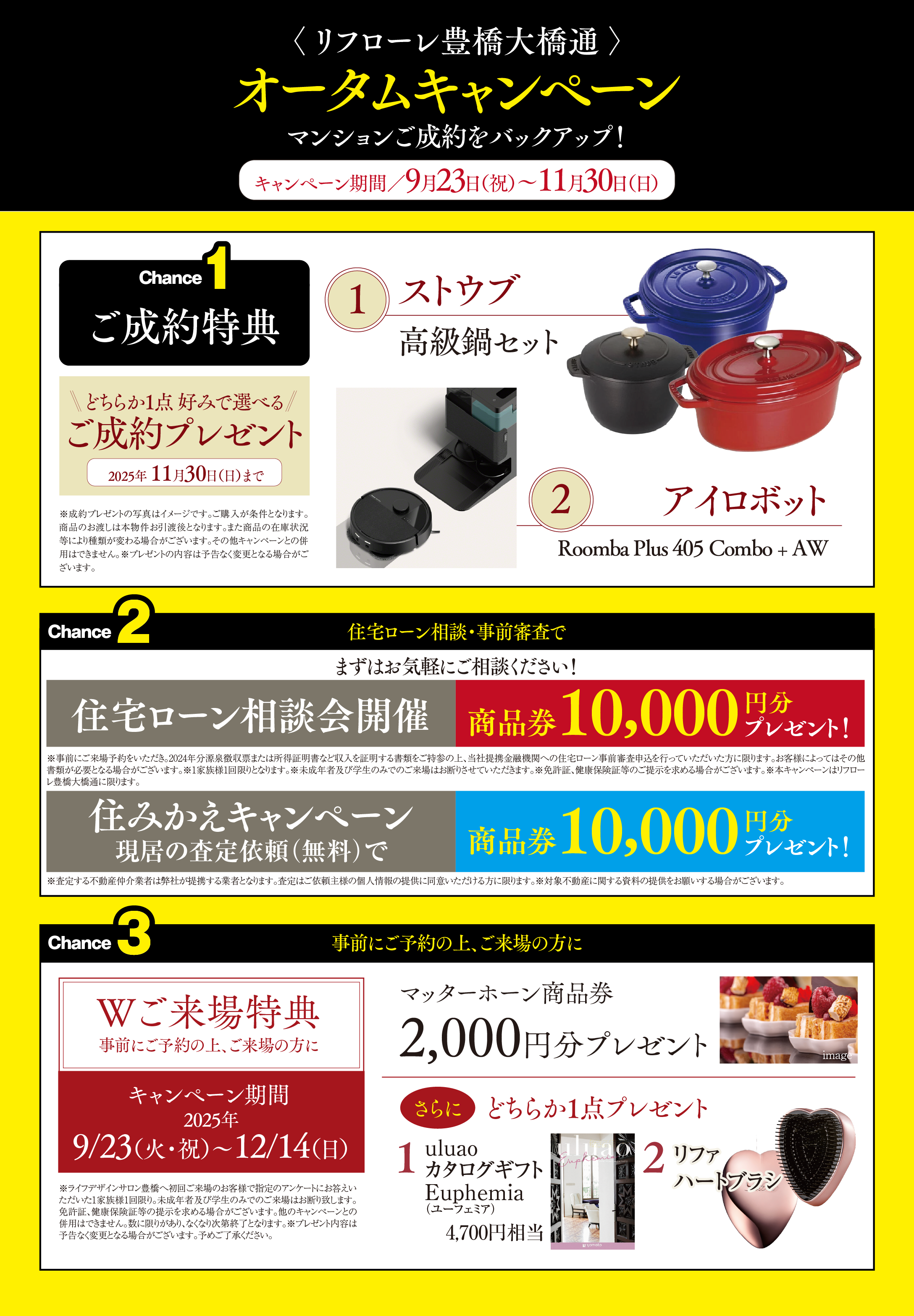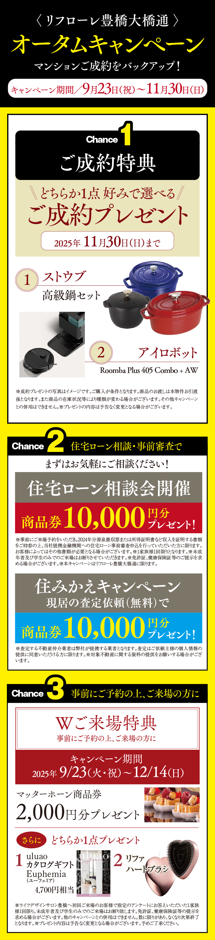 ※Yahoo!不動産上において資料請求または見学予約をし、60日以内にご成約・ご応募いただくことが条件となります。アンケート回答事項のうち物件のレビュー、年代、性別、家族構成の情報はYahoo!不動産上で匿名公開する場合がございます。先着順とは売買契約書がアップロードされた順のことを指します。先着人数に達した場合には対象外となります。詳しくは係員にお尋ねください。※資料請求または見学予約を2025年10月31日までに行った方が対象です。