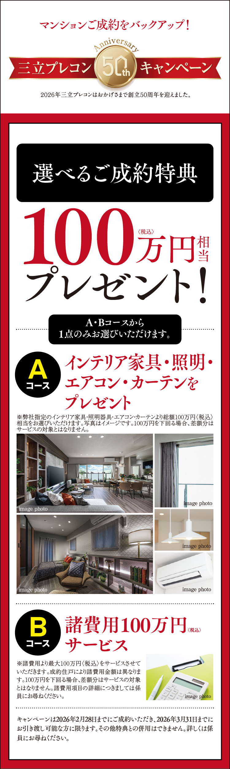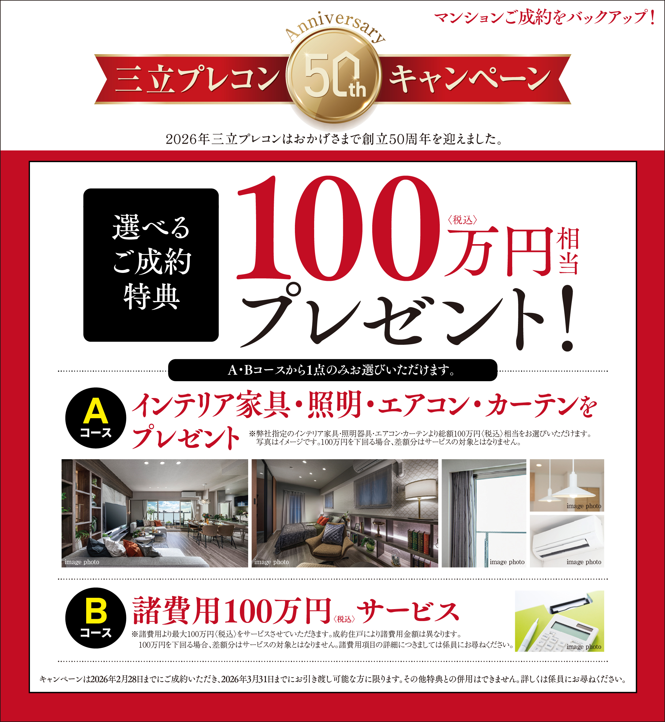 ※Yahoo!不動産上において資料請求または見学予約をし、60日以内にご成約・ご応募いただくことが条件となります。アンケート回答事項のうち物件のレビュー、年代、性別、家族構成の情報はYahoo!不動産上で匿名公開する場合がございます。先着順とは売買契約書がアップロードされた順のことを指します。先着人数に達した場合には対象外となります。詳しくは係員にお尋ねください。※資料請求または見学予約を2026年2月15日(日)までに行った方が対象です。